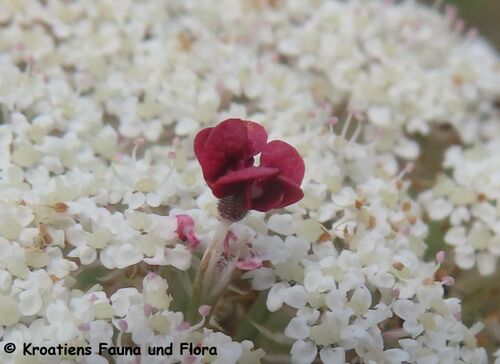 Diese purpurfarbene Mohrenblüte ist steril, kann also weder Pollen noch Früchte bilden. Sie dient dazu, mehr Insekten anzulocken. Warum es sowohl Dolden mit als auch ohne diese Sonderform gibt, ist nicht bekannt.