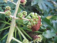 - Die großen Blätter sind ebenfalls rund und haben 9 tief eingeschnittene Lappen. Diese Form ähnelt sehr den Blättern Ricinus communis Linné, 1753 - Wunderbaum, ricinus.