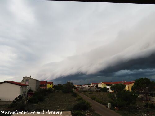 Heute ist er aber wieder kraftvoll wie eh und je und hat in aller Gemütsruhe eine Shelf Cloud gebaut, die er mit einer dicken Gewitterzelle versehen hat. Langsam hat sich diese mit Blitz und Donner aus dem Süden über die Insel Vir geschoben, wobei am Rand der typische Abbruch zu sehen war. Und wenn man genau hinsieht erkennt man, dass dieser Rand ähnlich aussieht wie die fließenden Wolken der Burawalze über dem Velebit. Da wollte Monsieur Jugo wohl seiner Lady aus den Bergen zeigen, dass nicht nur sie solche Formationen bilden kann. Und seine ist auch noch mobil….