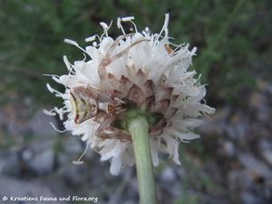 Manchmal sieht man an Wegrändern oder auf steinigen Flächen eine hohe, ziemlich sparrige Pflanze mit weißen Blüten. Es ist der Riesen-Schuppenkopf, der entlang der Küste des Mittelmeeres weit verbreitet ist. Auch er wurde weiter kultiviert und man findet ihn in so manchen mitteleuropäischen Gärten als Zierpflanze.