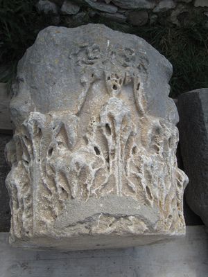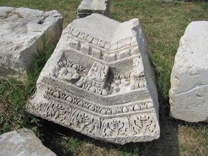 Im Jahr 2010 lagen die vorhandenen Fragmente noch recht willkürlich in der Gegend herum - so, als wäre der Tempel erst eingestürzt. Neben einem gut erhaltenen Kapitell reihten sich auf dem Fundament zahlreiche Friese mit Blumenmotiven.