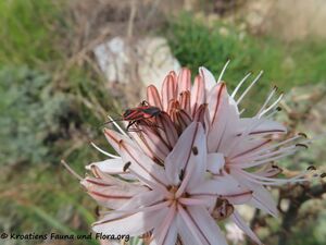 At first I thought the bad condition is due to the drought this winter, because then the plants grow much lower here. Looking more closely, I saw many nymphs of this bug on the florescences, hungrily sucking on the petals. The state of development (wings already indicated) is probably the last stage before moulting into the imago. And the numerous bug nymphs explain the desolate condition of the asphodel.