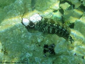 This blenny with its robus body is one of the largest representatives of the family. Its characteristics are 7 chololate brown stripes extending from the abdomen to the dorsal fin. He also has two pairs of tentacles, those over the eyes are branched.