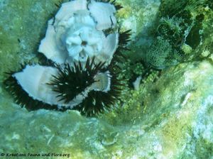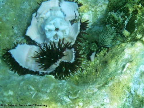 - Dieses Bild zeigt einen Sphaerechinus granularis Lamarck, 1816 - Violetter Seeigel, ljubičasti ježinac, den Kinder am Morgen aus dem Wasser geholt und nach einiger Zeit wieder zurück geworfen haben. Dies war für den Seeigel das Todesurteil und sofort haben sich verschiedene Lippfische über ihn hergemacht. Am Schluss, als nur noch vereinzelte Eier übrig waren, kam auch der Schleimfisch zu seinem unerwarteten Mal.