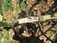 - ✔Der Ascomycet Botrytis fabae Sardiña, 1929 (Botryotinia fabae) löst die Schokoladenfleckenkrankheit auf den Blättern, den Stielen aber auch den Schoten der Ackerbohne aus. Auf dem Bild sieht man sie im Anfangsstadium. Bei optimalem Wetter fließen die Flecken ineinander, es entsteht ein Rasen aus Sporen und die Pflanze wirft die Blätter ab.